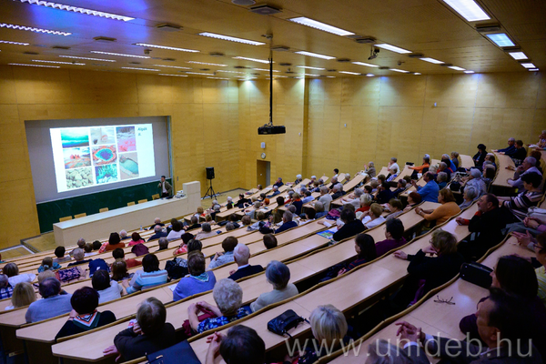 Mérő László matematikus, publicista, pszichológus, játékfejlesztő, az ELTE Pszichológiai Intézet és a Babeș–Bolyai Tudományegyetem professzora tart előadást a Debreceni Egyetem Műszaki Karán.